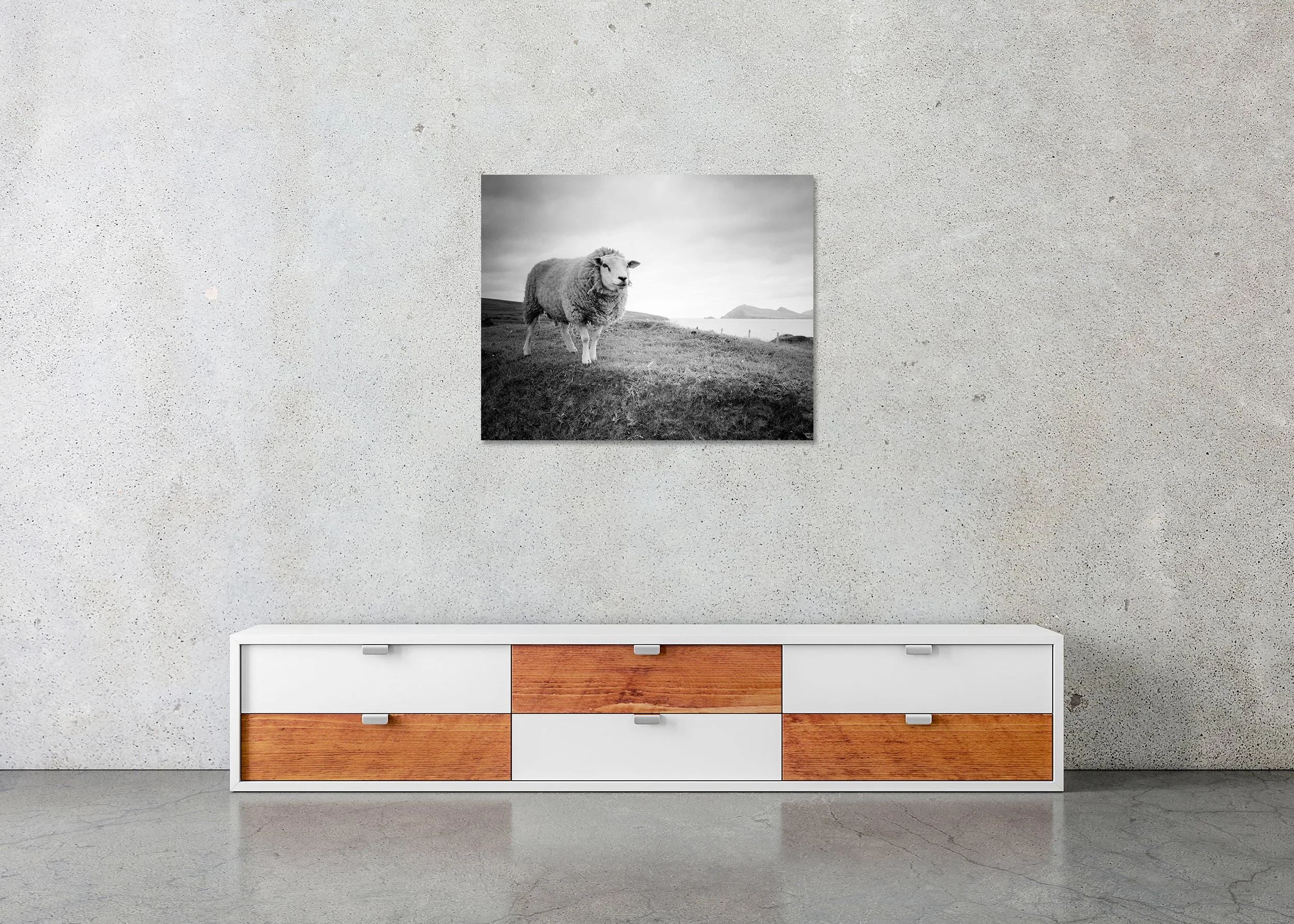 Gerald Berghammer - Black and white landscape photography. A sheep standing on grassy land near the Atlantic Ocean with hills on a small island.