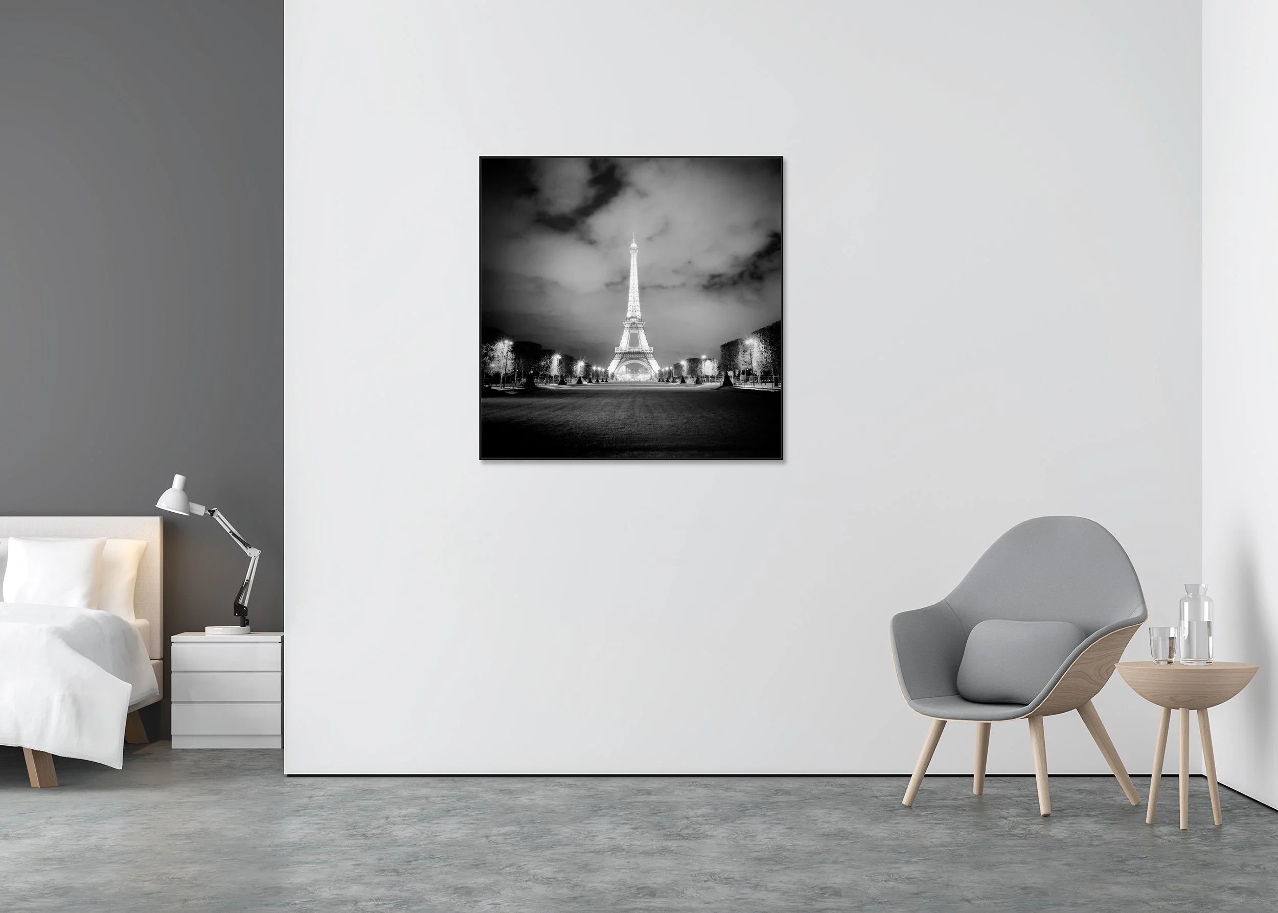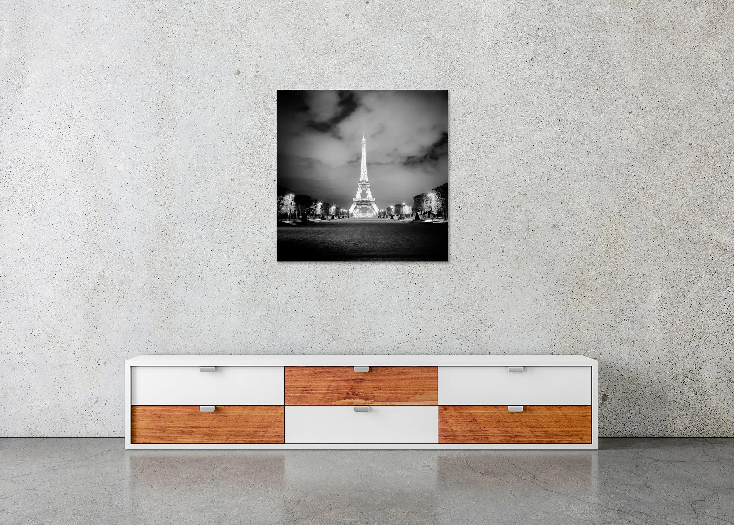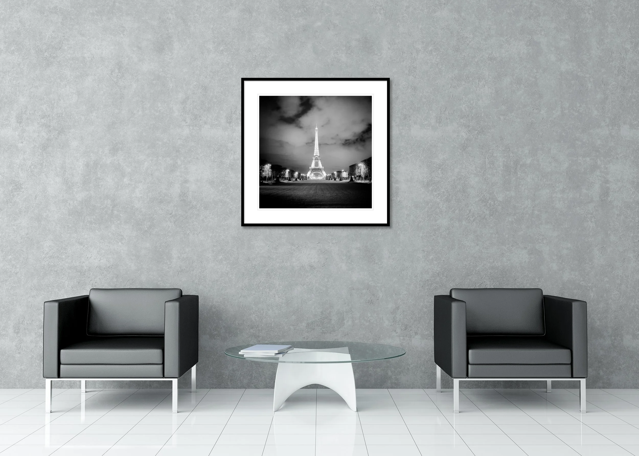 SILVERFINEART - Limited Black and white Cityscape photography of the Eiffel Tower in Paris, illuminated at night, with empty foreground and cloudy sky.