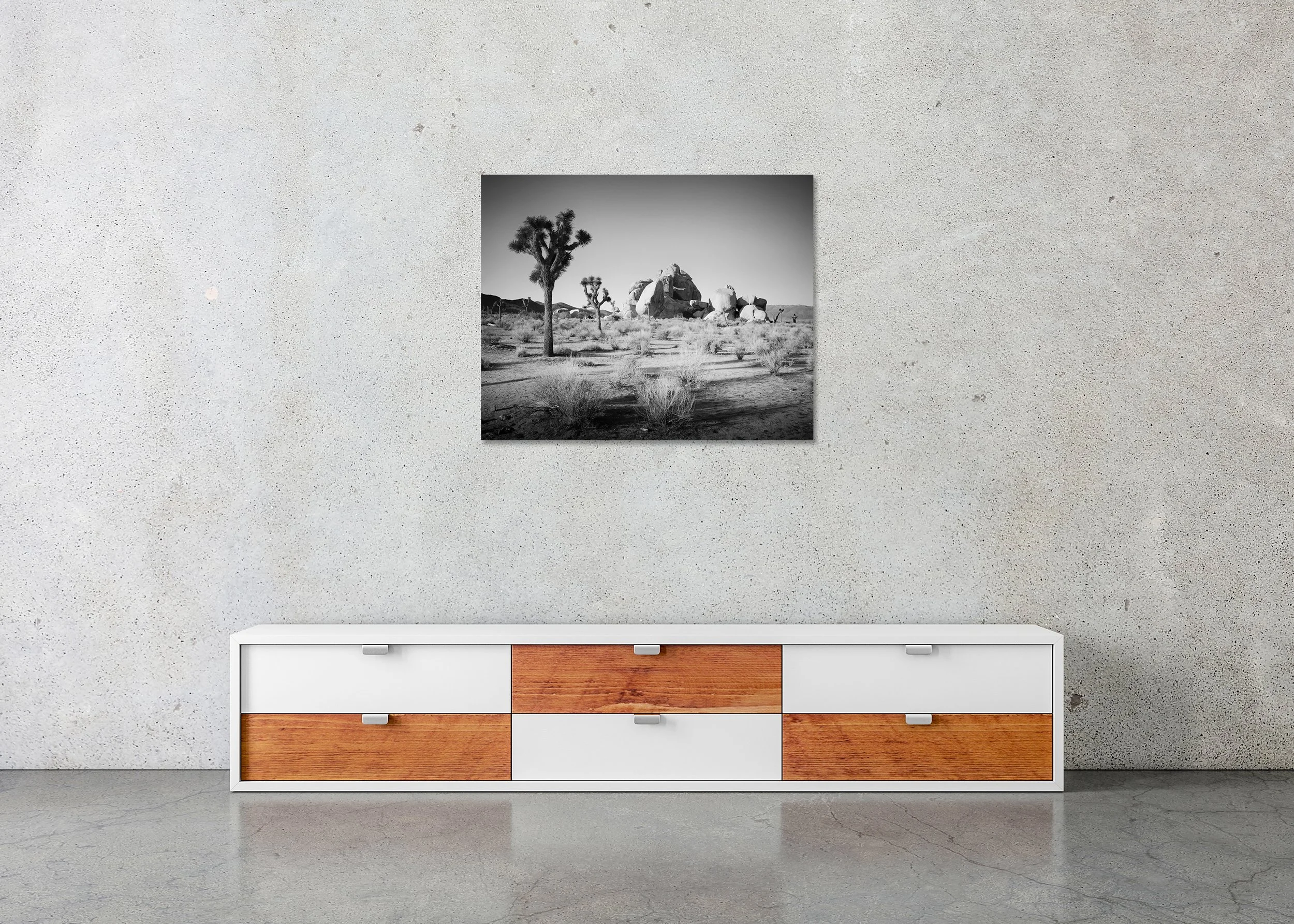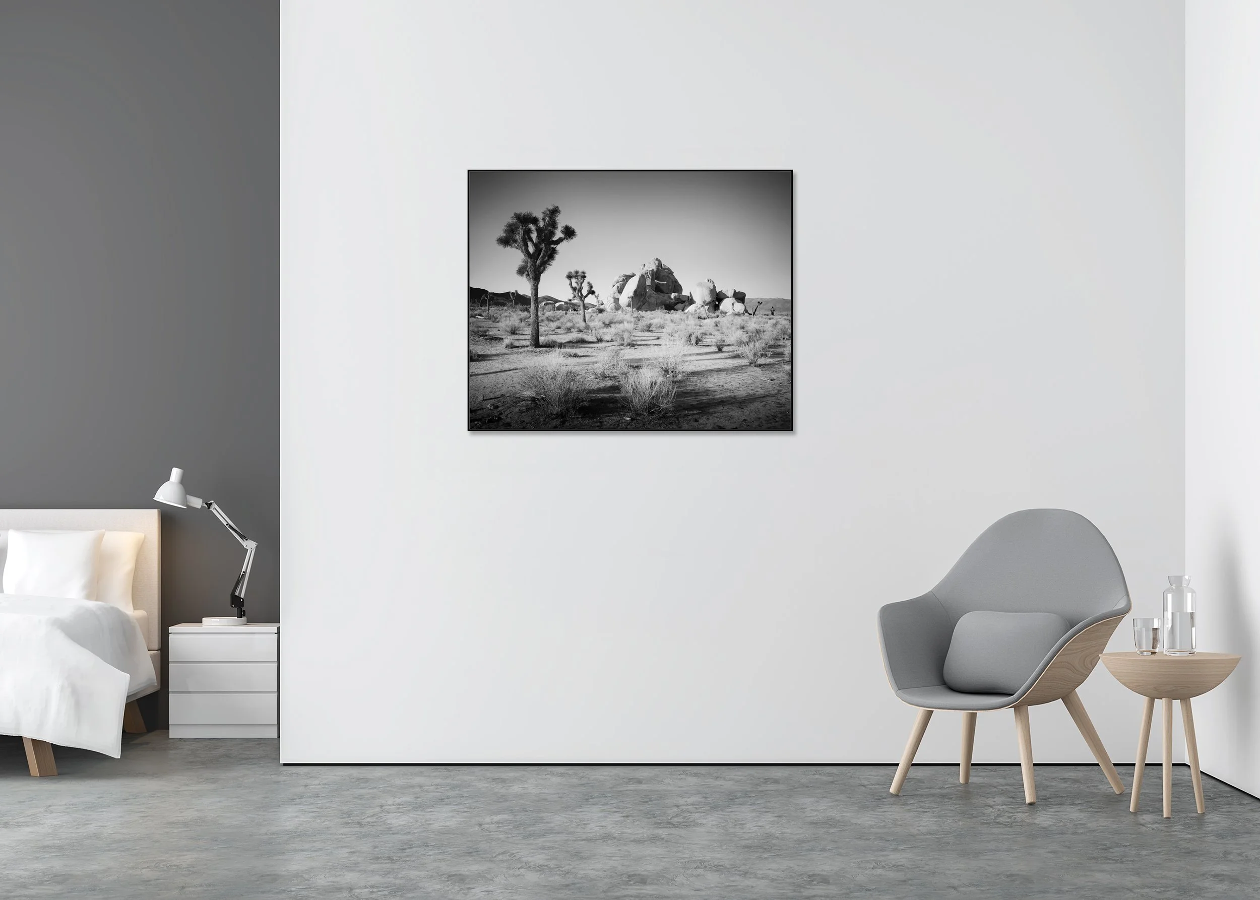 Limited Edition Black and White desert landscape with Joshua trees, rocky formations, and dry bushes under a clear sky, California, USA.