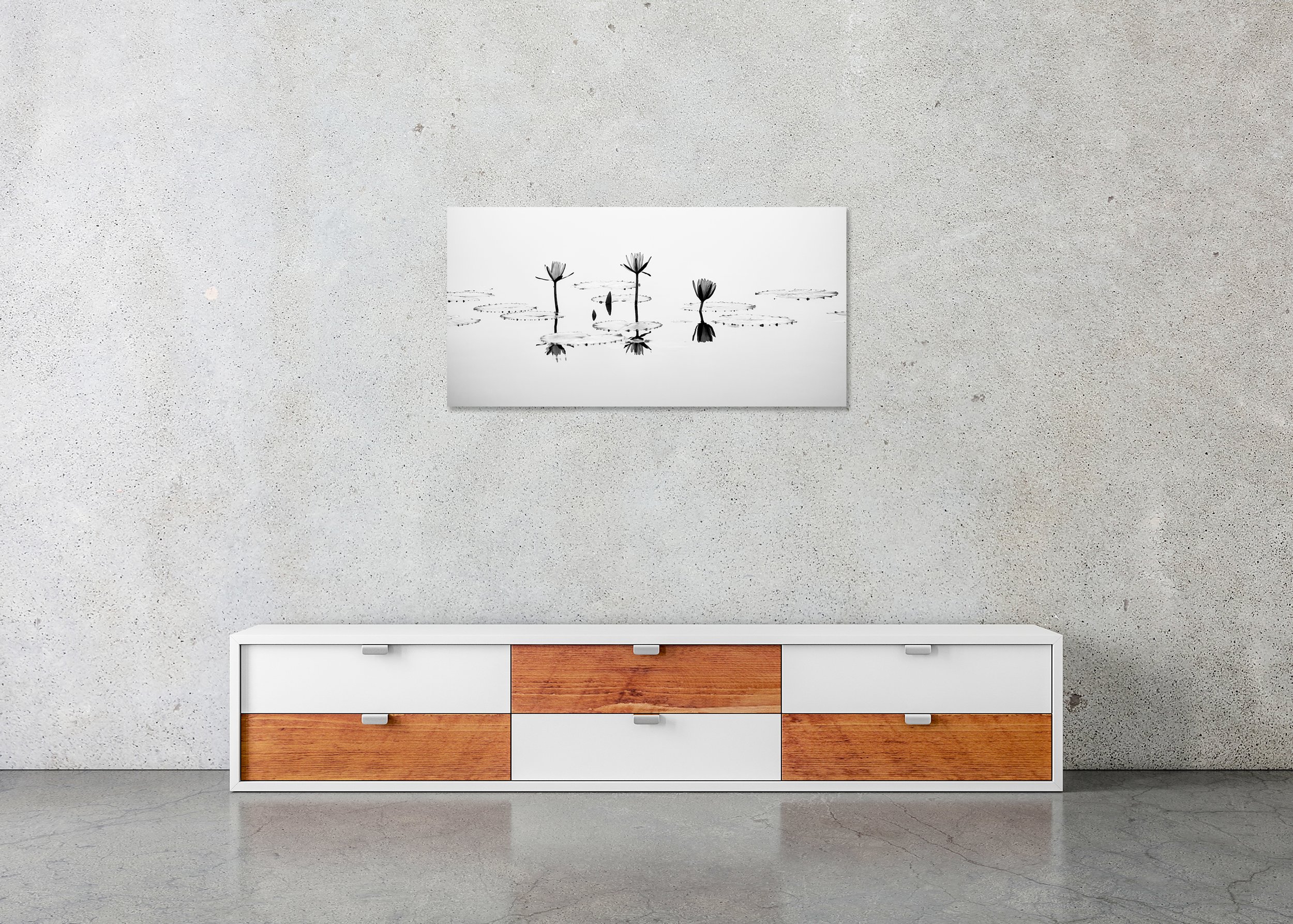 Gerald Berghammer - Black and white long exposure waterscape photography of three Lotus Flower on a calm pond, with their reflections visible in the water.