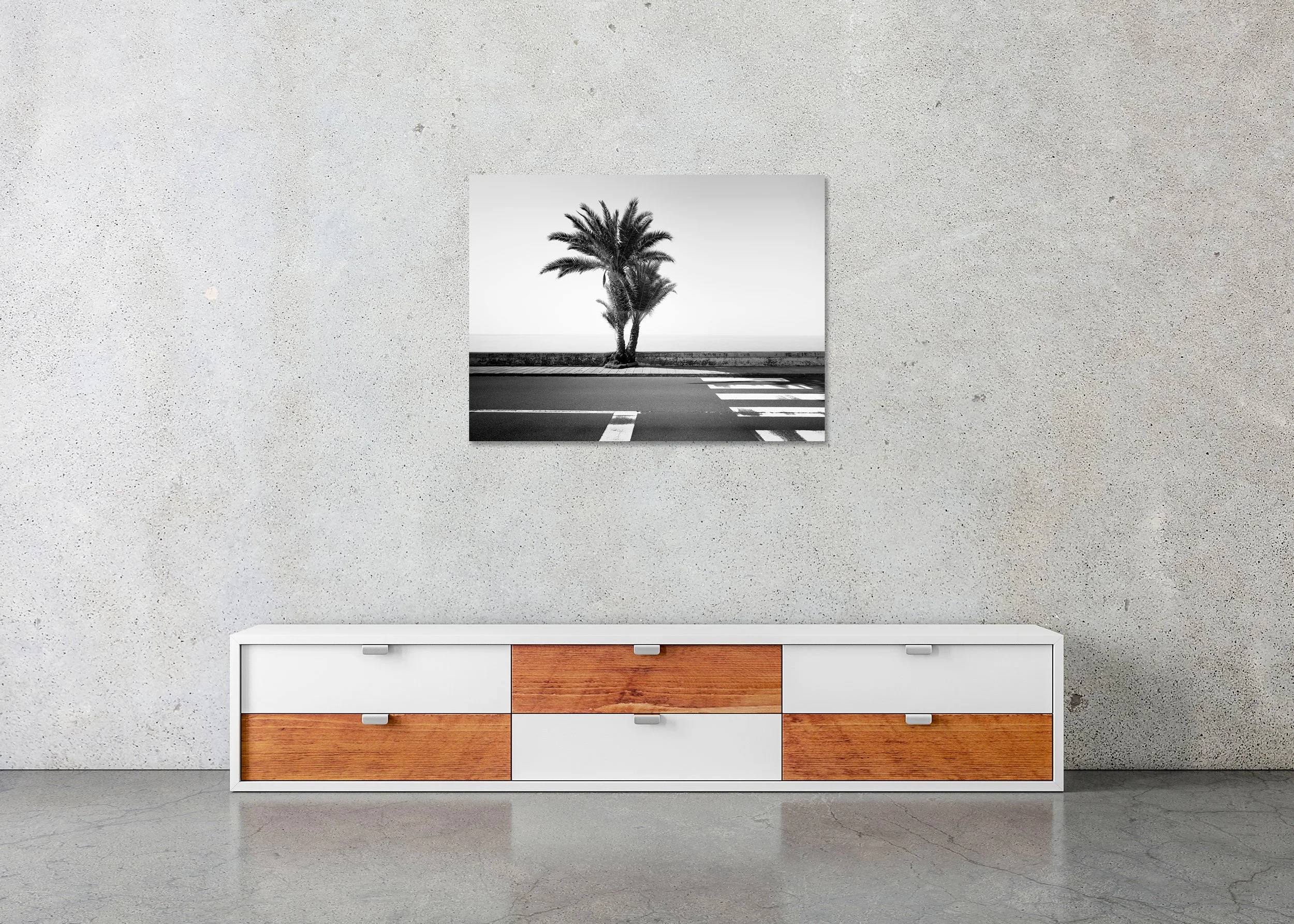 Gerald Berghammer - Black and white landscape photography. Palm tree next to a sidewalk and crosswalk on a road, with the ocean in the background.
