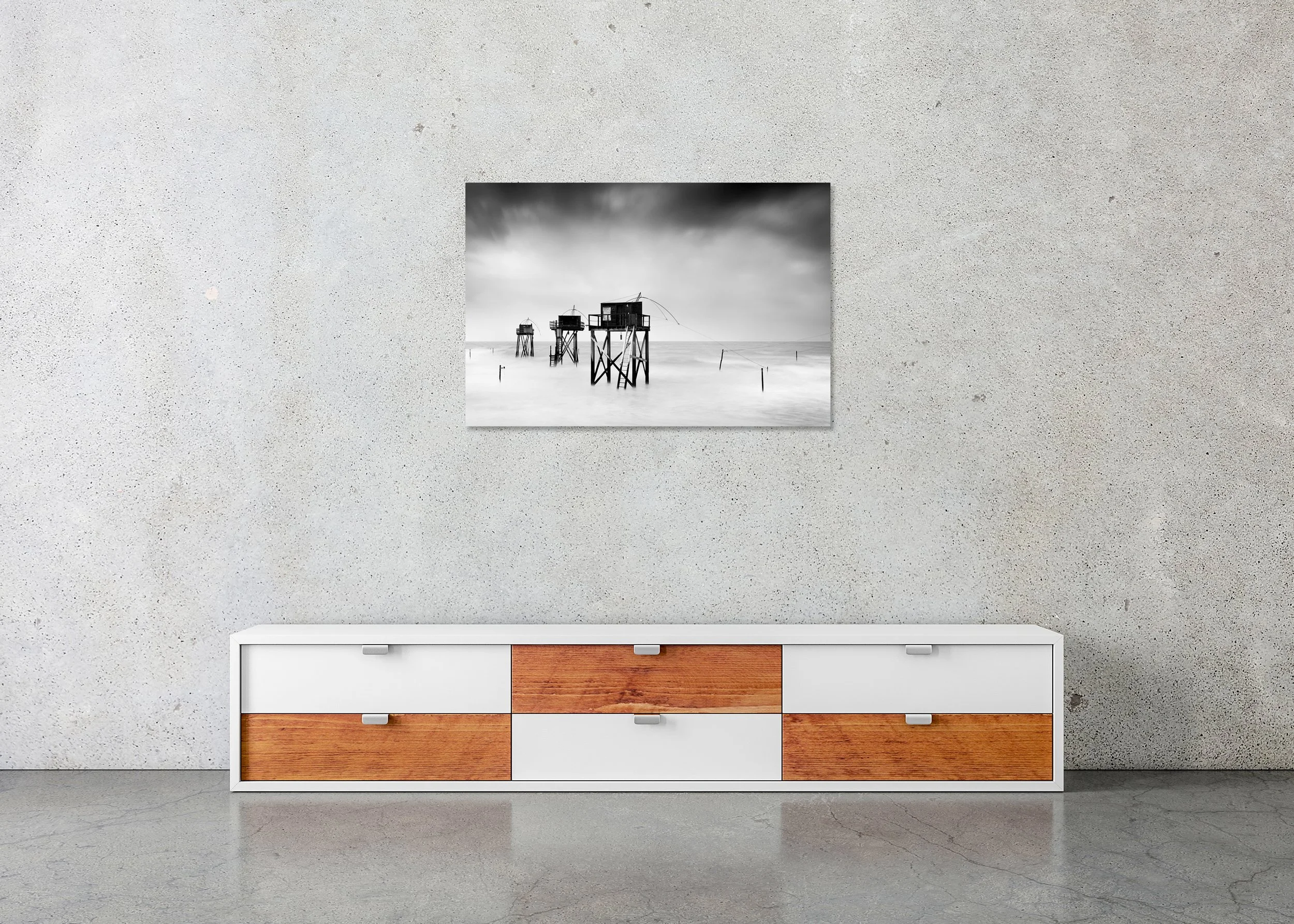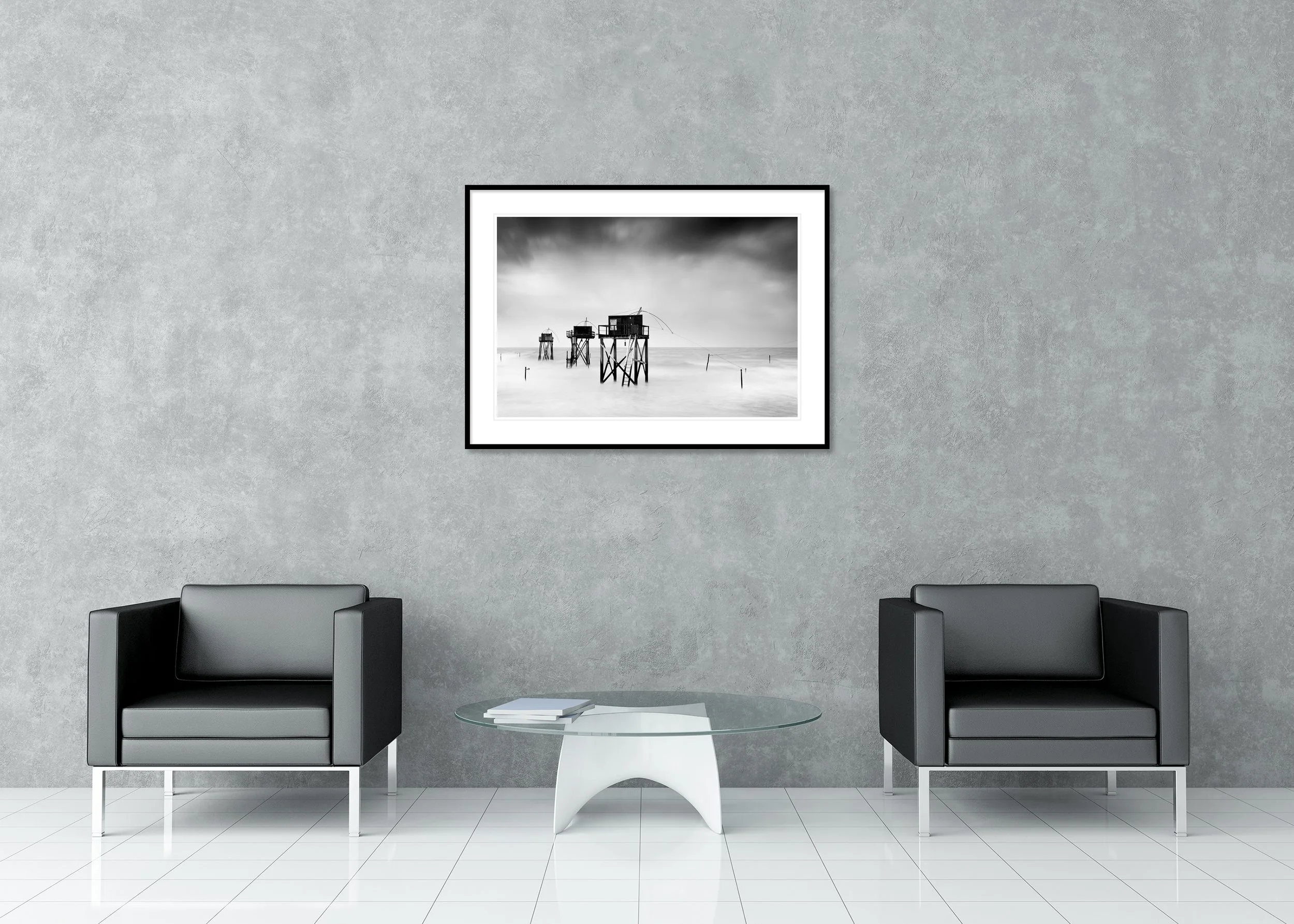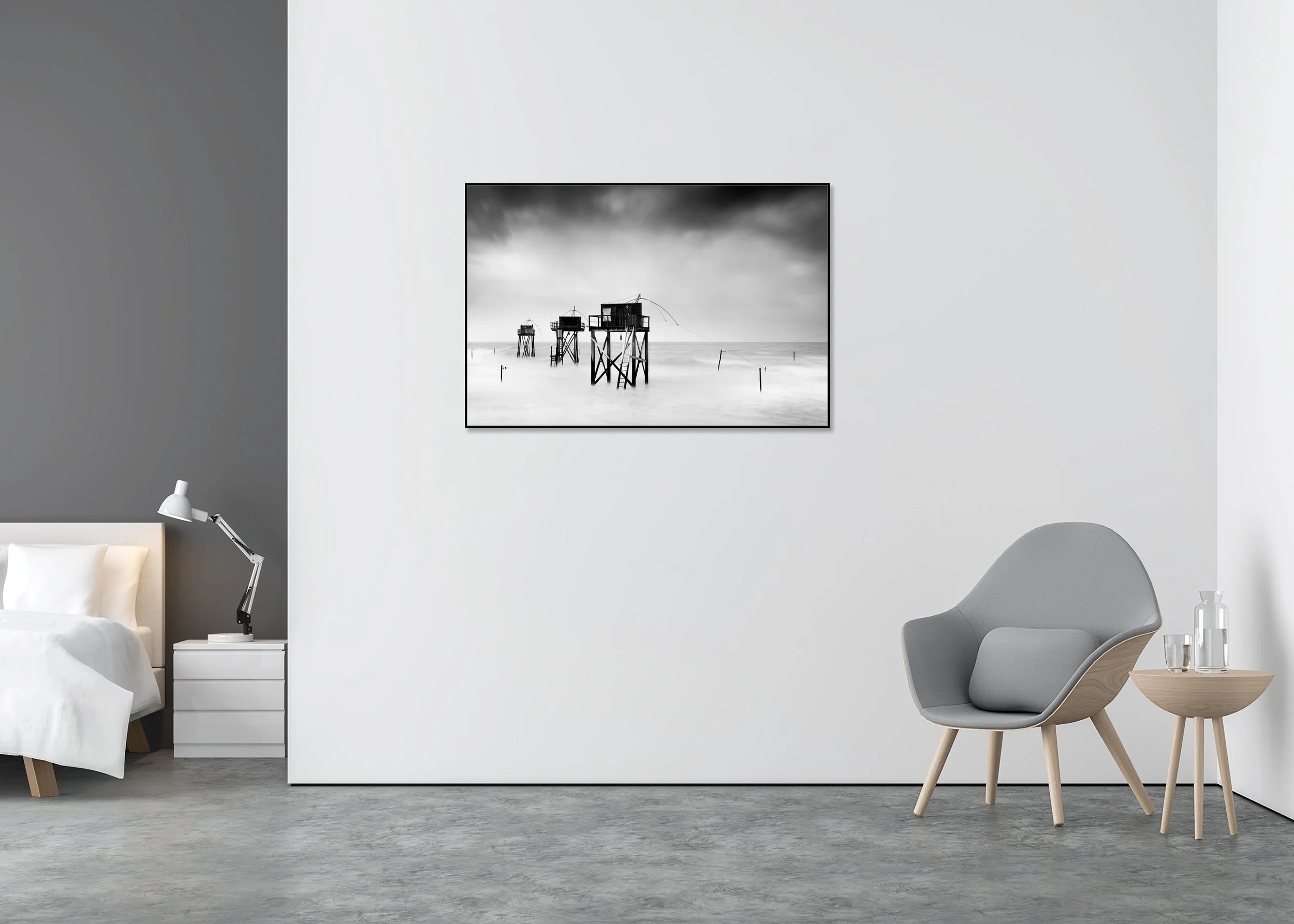 Gerald Berghammer - Black and white photography. Fishermen's huts on stilts in stormy weather in the Atlantic Ocean, fishing lines are extended from each hut.