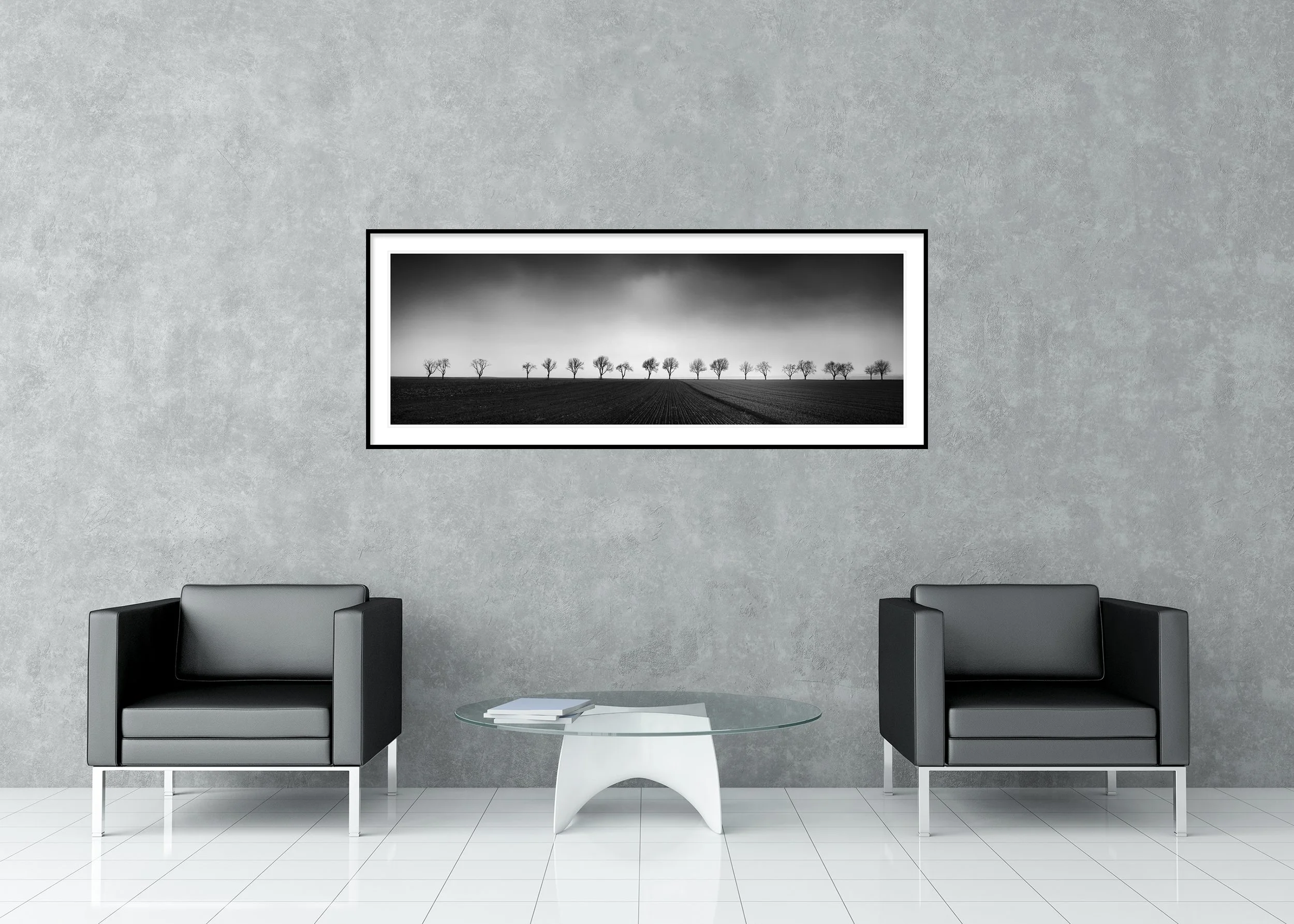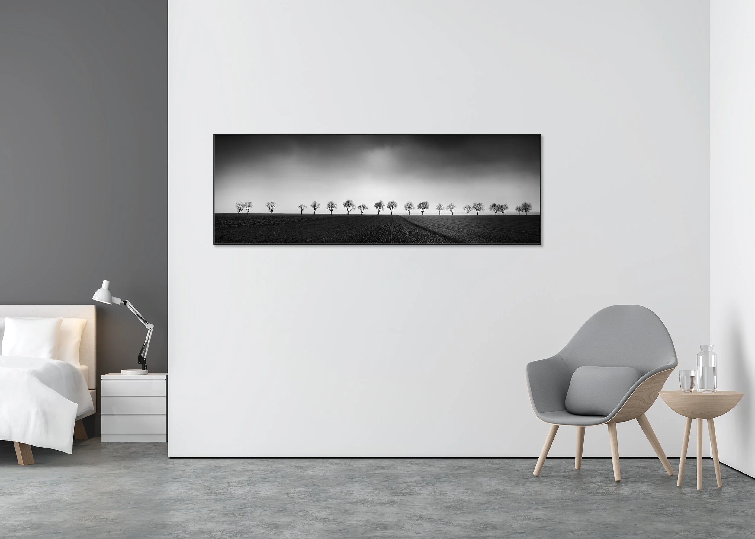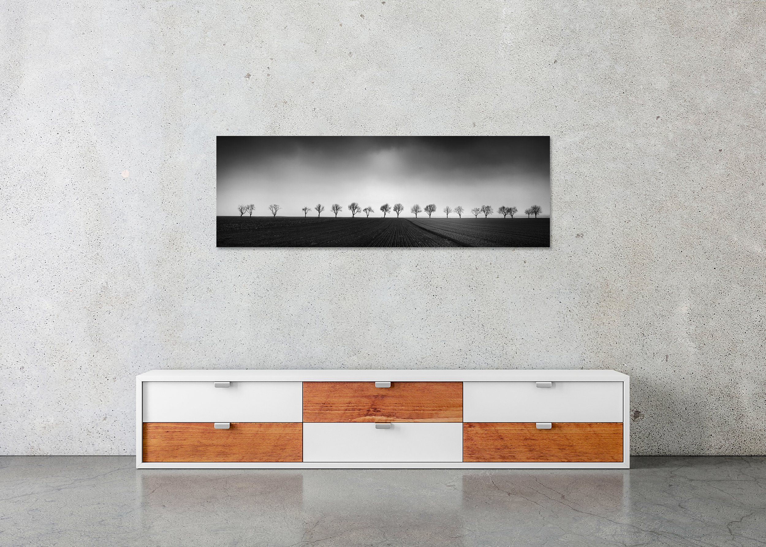 Gerald Berghammer - Black and white panorama photography. Landscape with a row of leafless trees across a flat field under a cloudy sky.