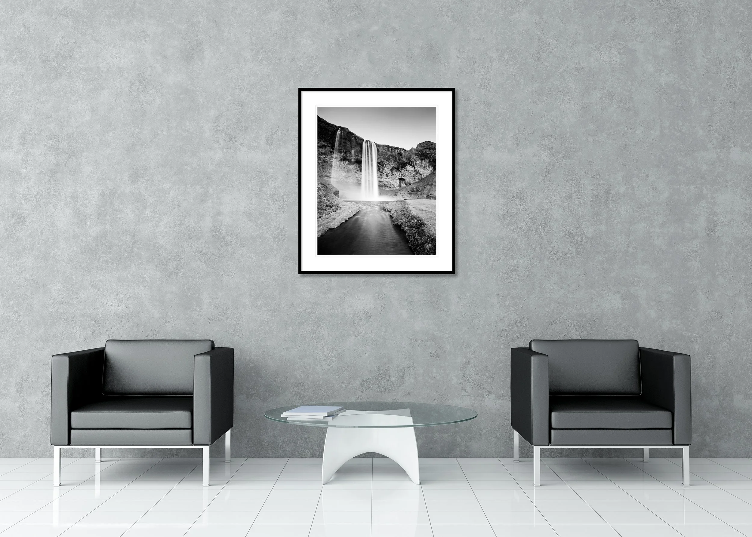 Gerald Berghammer - Black and white waterscape photography- Limited Edition. Tall waterfall flowing into a river, with rocky cliffs and terrain surrounding it.