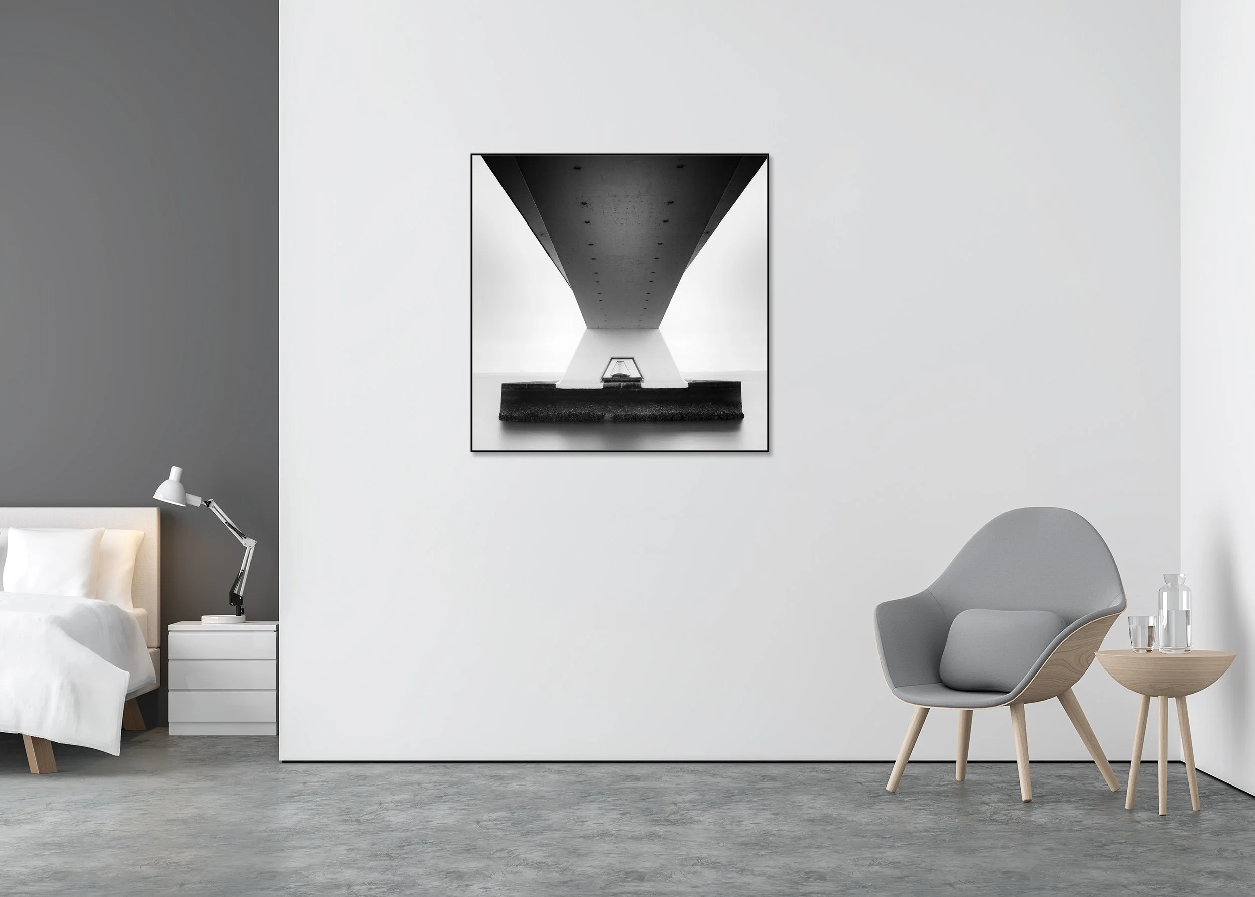 Gerald Berghammer - Black and white cityscape photo. Underneath view of a bridge with large support pillars, showing the underside and the water below.