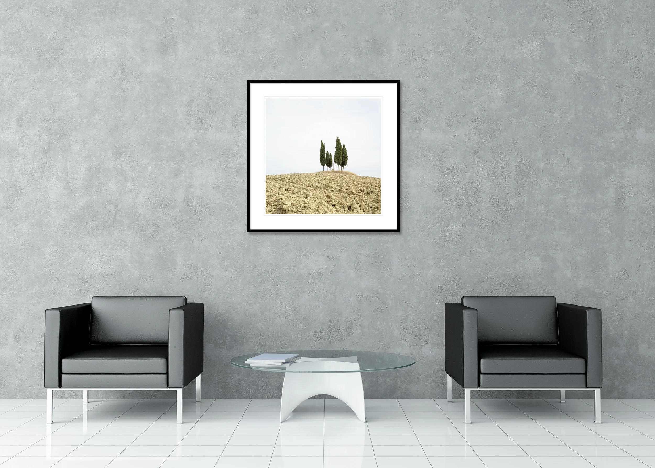 Gerald Berghammer - Color minimalist landscape photography. A small group of tall, slender cypress trees on a dry, barren hilltop against a cloudy sky.