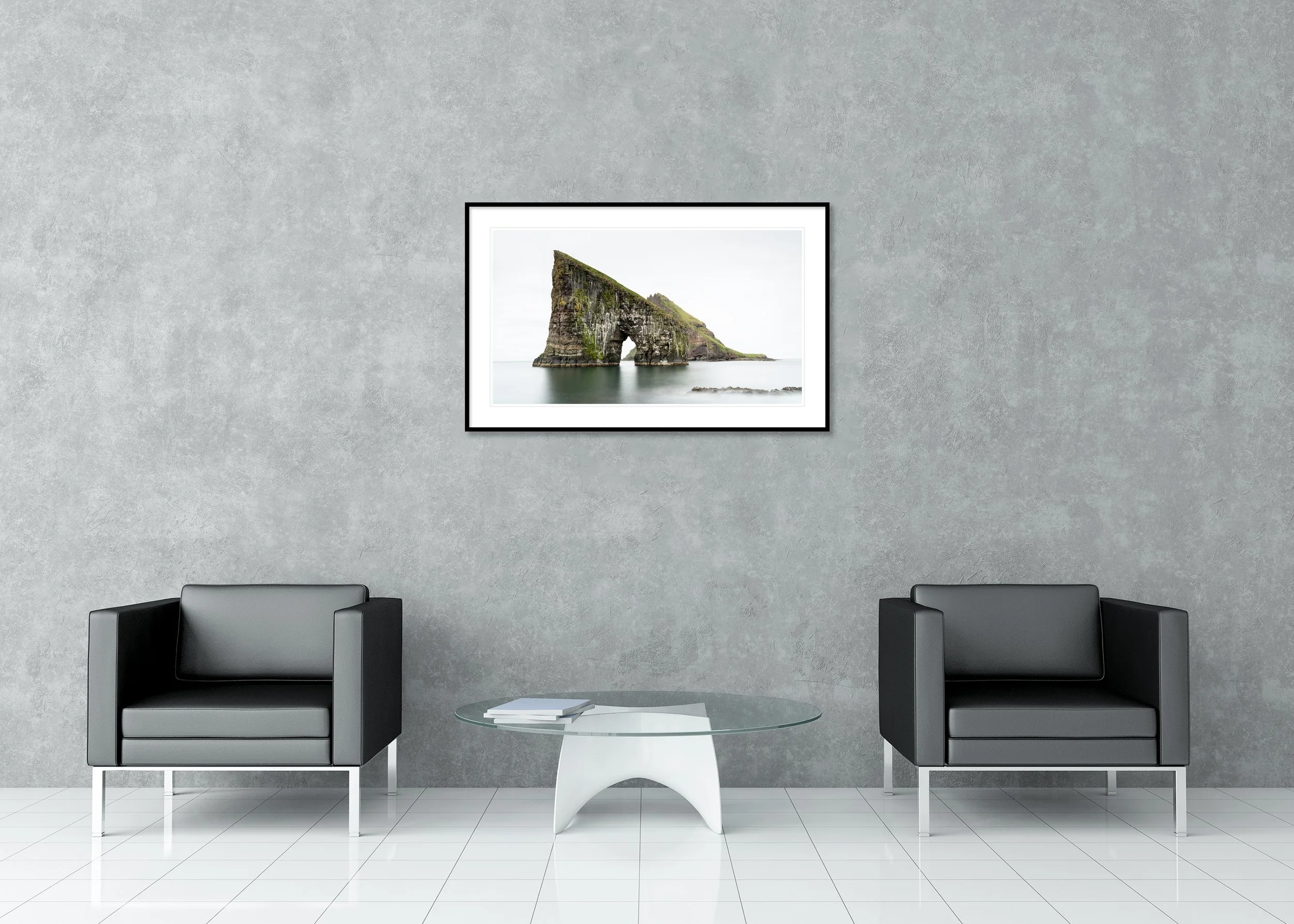 Drangarnir Sea Arch, minimalist color panorama, Faroe Islands.