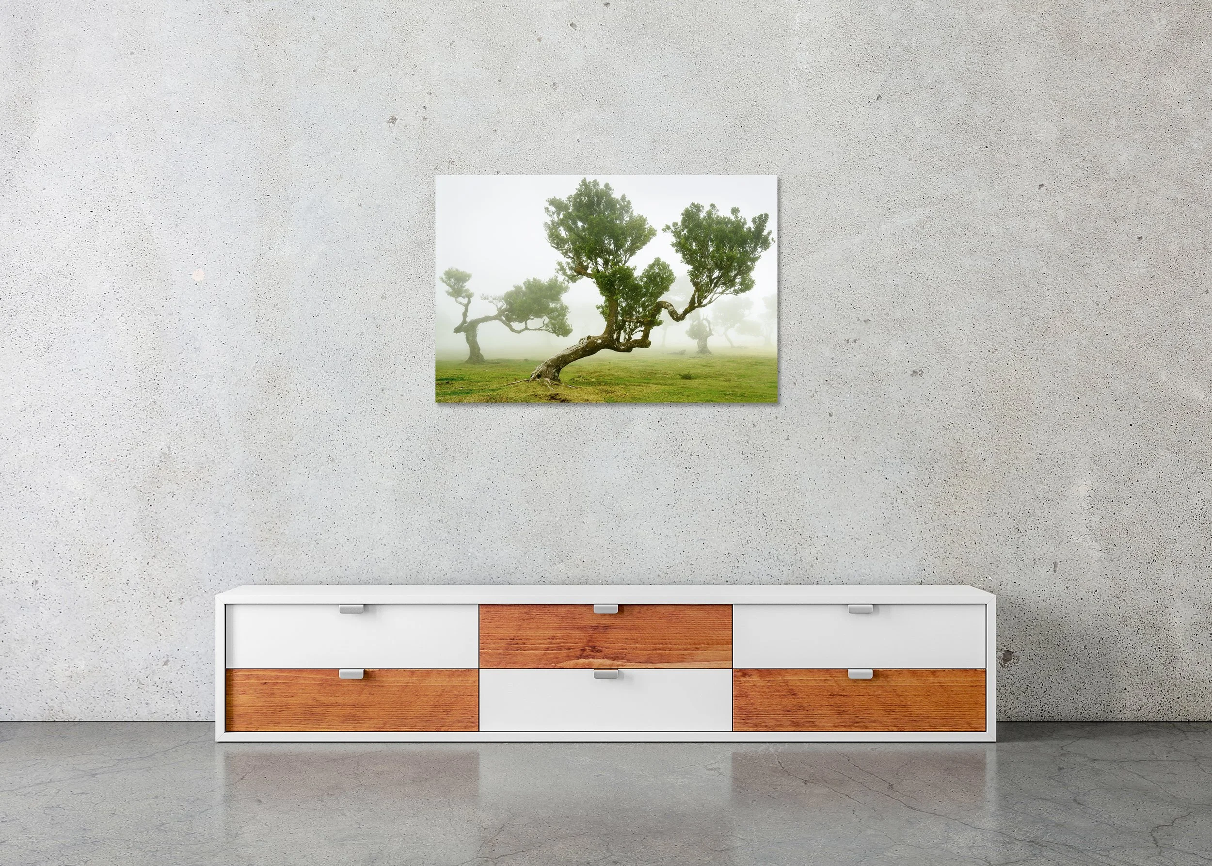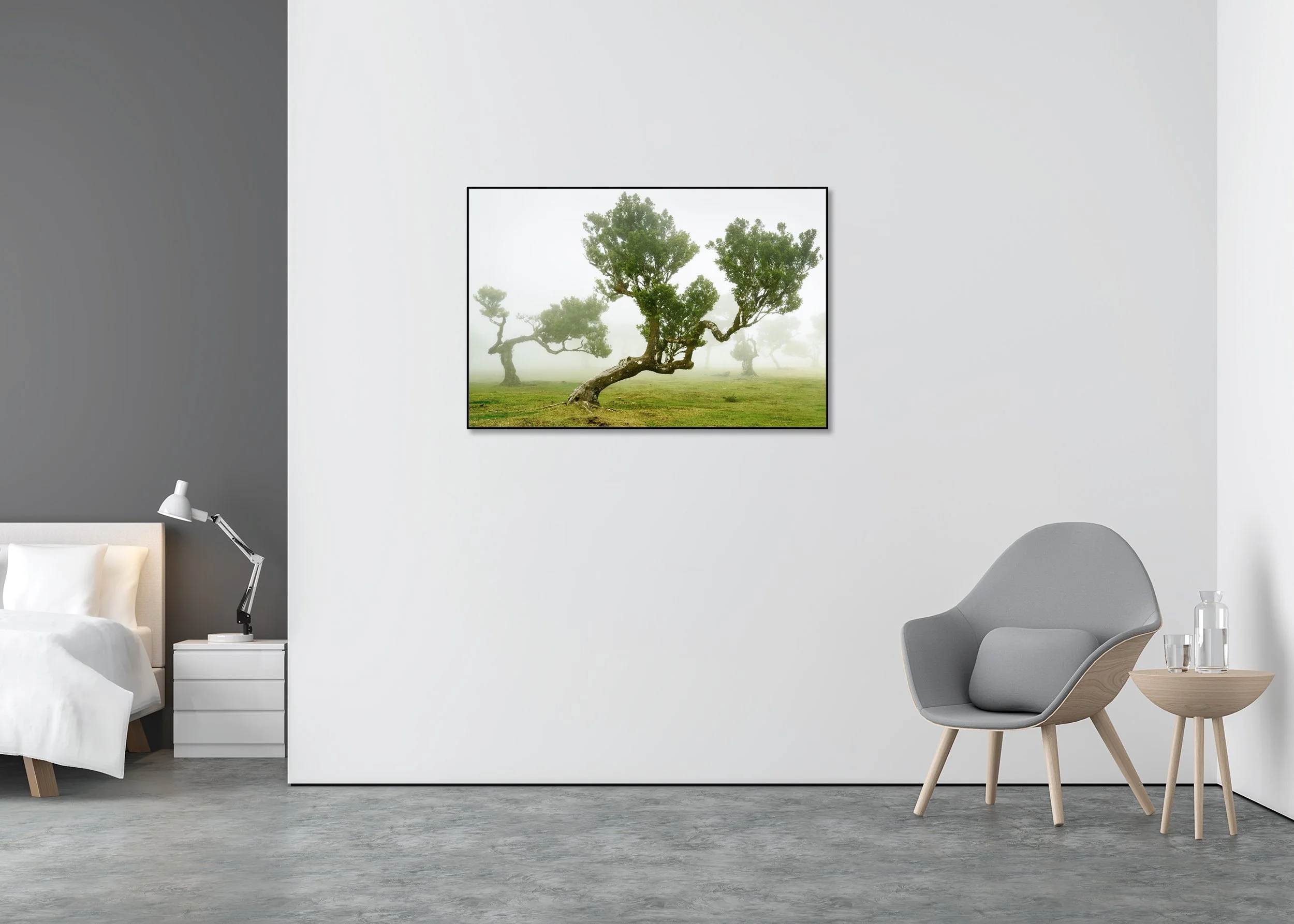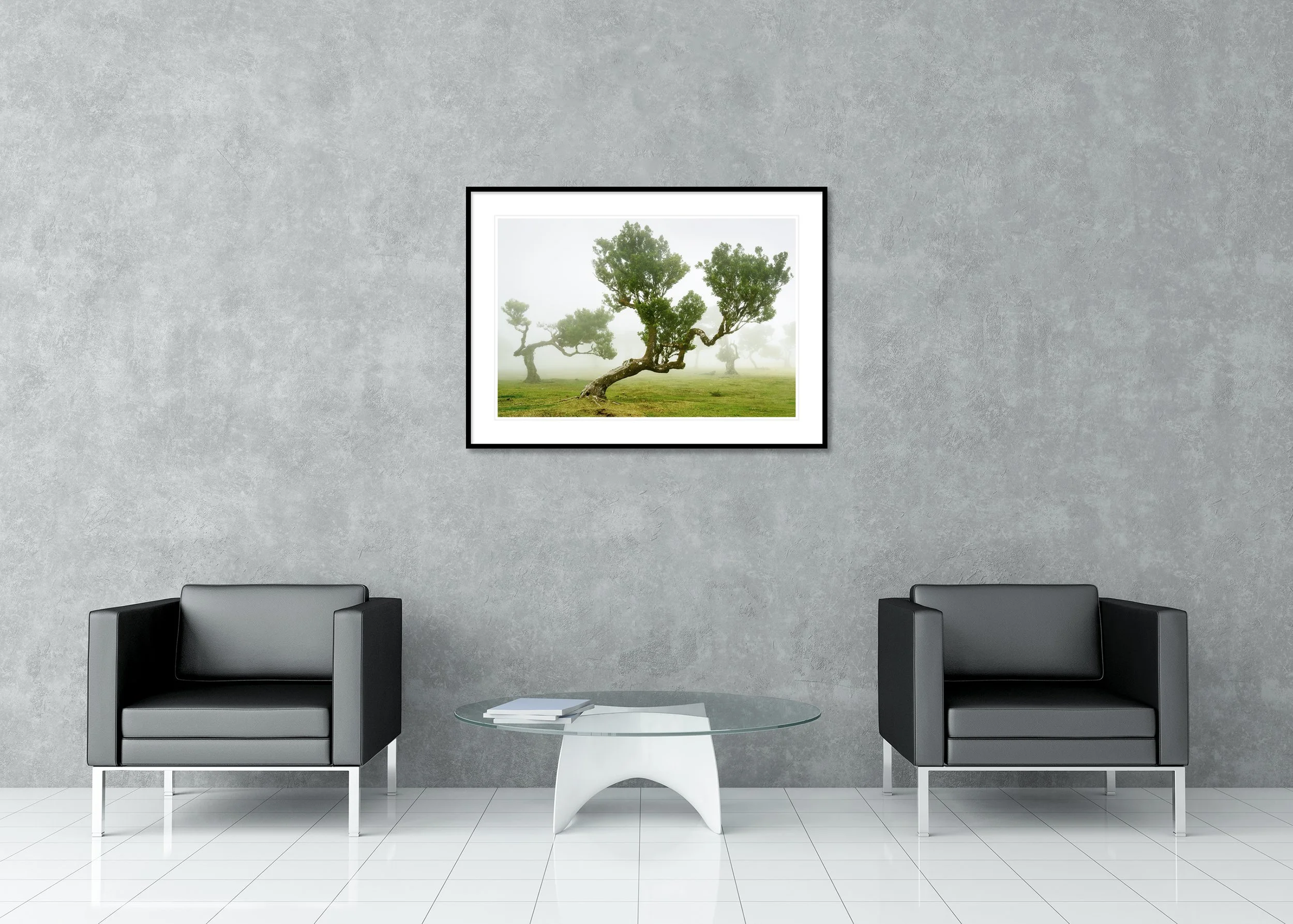 Gerald Berghammer - Color minimalist fine art landscape Photography. A foggy landscape with several twisted green bent laurel trees on a grassy field.