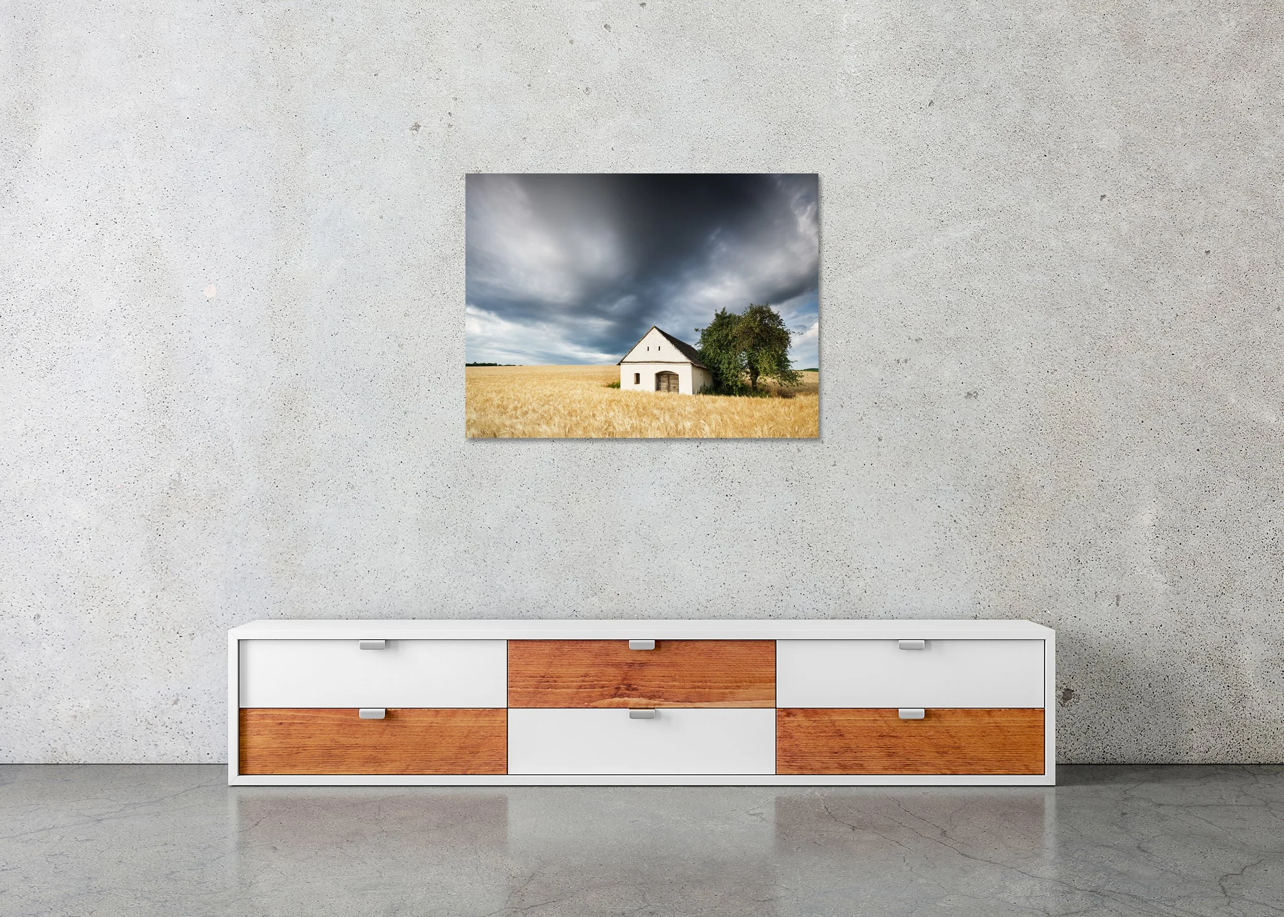 Gerald Berghammer - Fine Art Landscape Photography. A white barn with a dark roof beside a green tree in a wheat field under a cloudy sky.