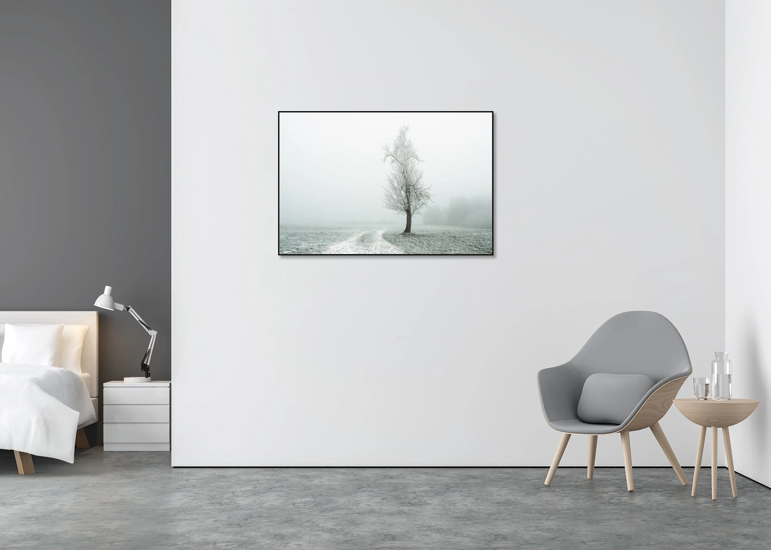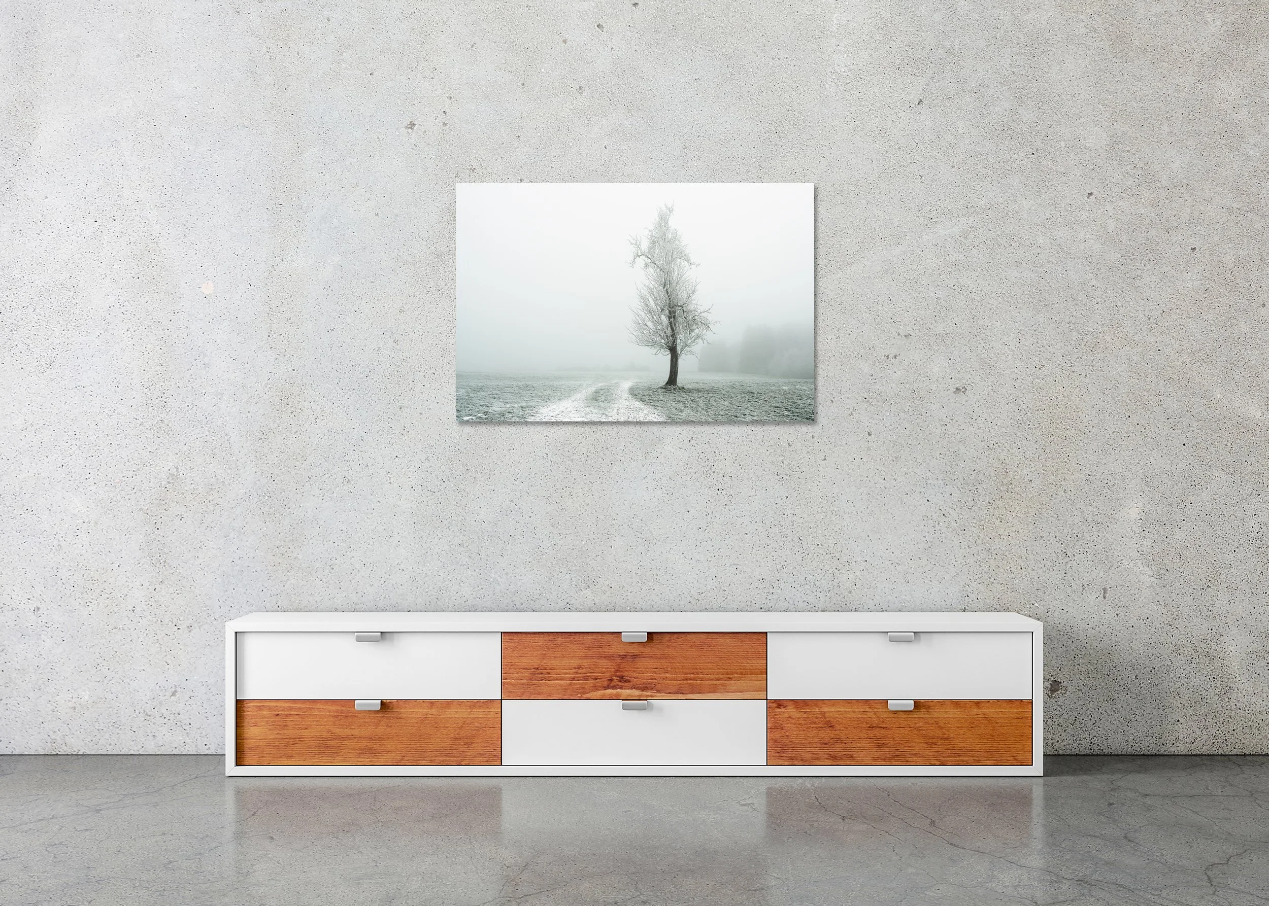 Gerald Berghammer - Color fine art photography. A solitary tree stands in a snow-covered field with a winding path, surrounded by foggy, winter landscape.