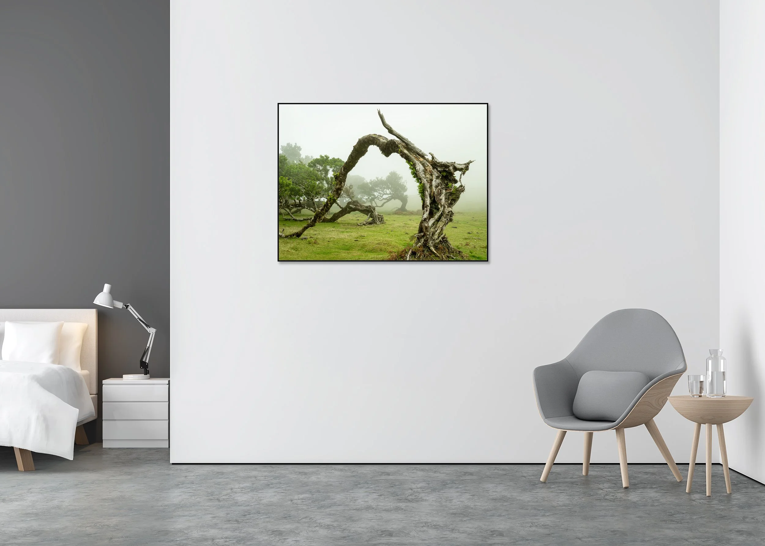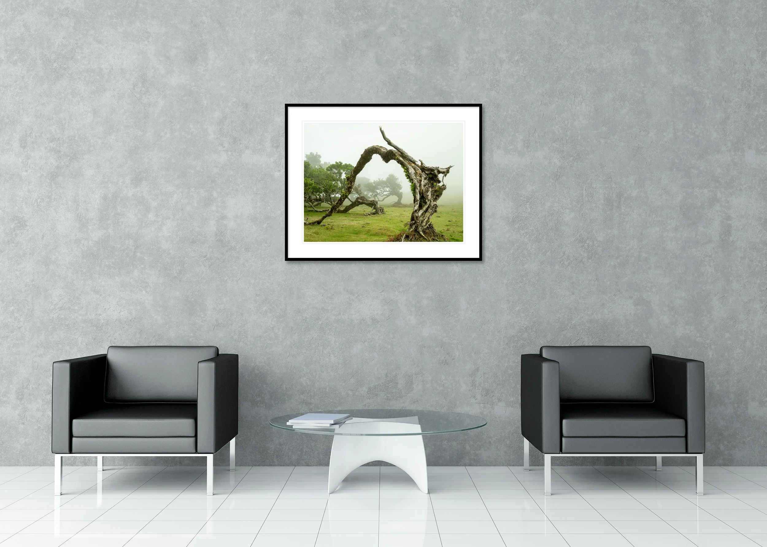 Gerald Berghammer - Limited Color Photography - Weathered, twisted laurel tree with a curved trunk in a foggy landscape with other trees and grassy ground.