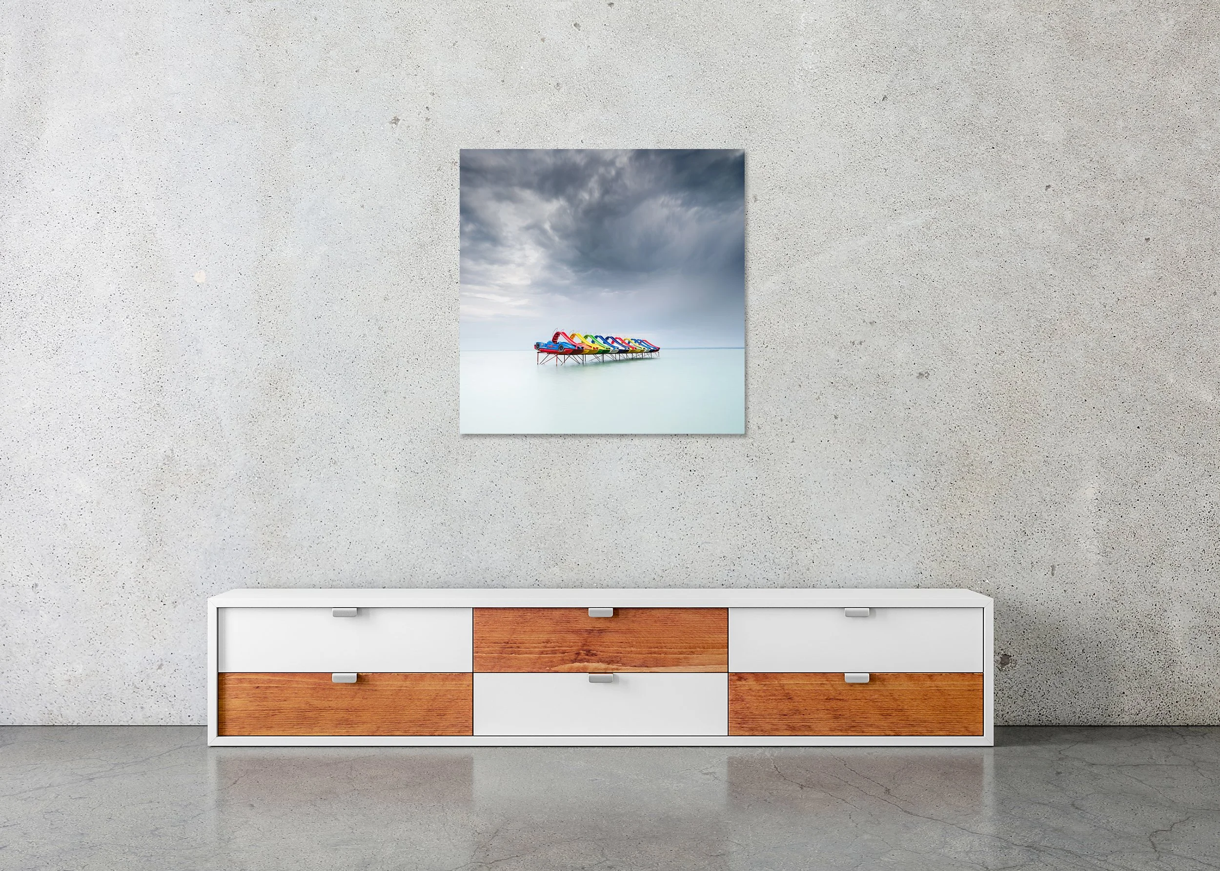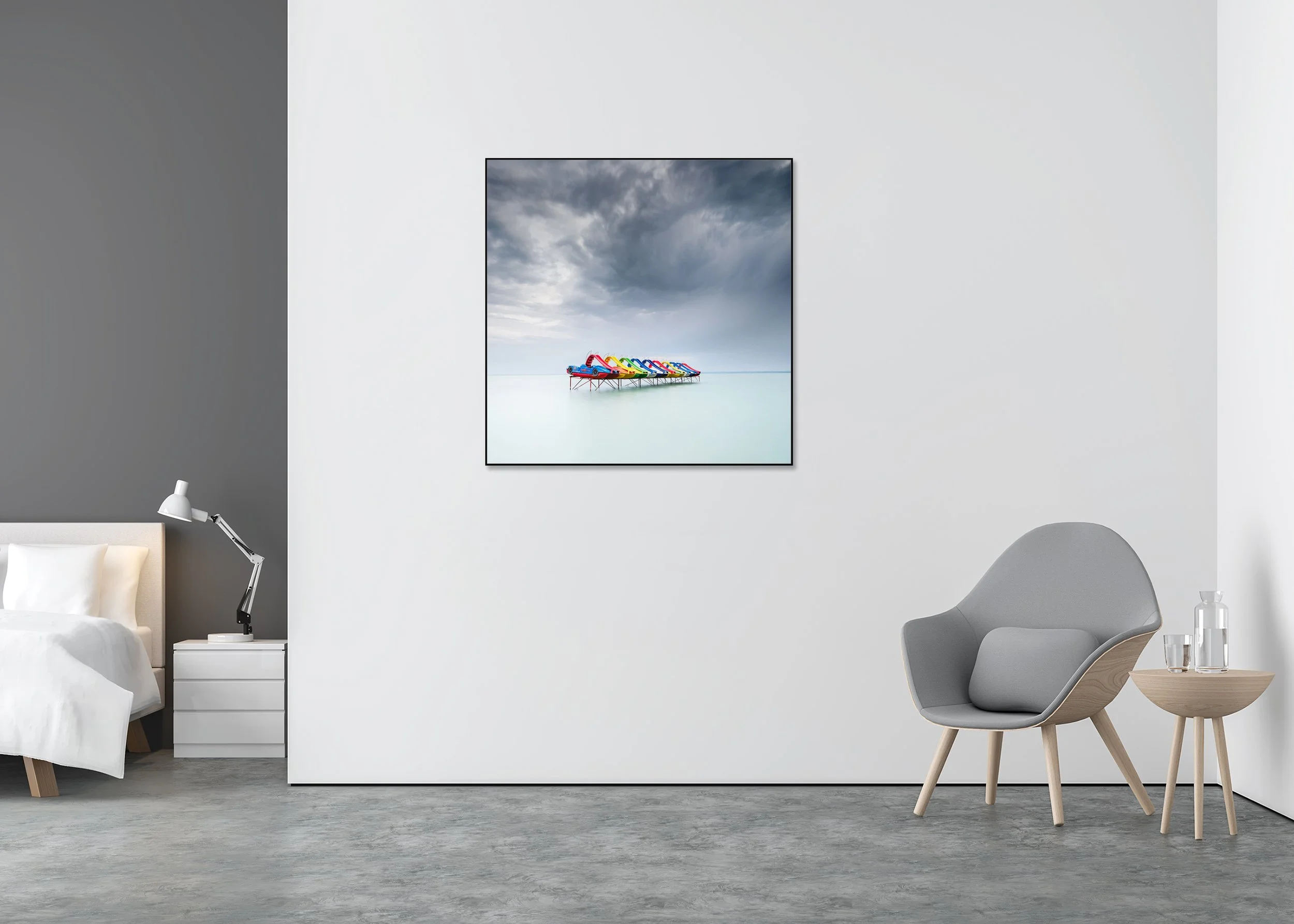 Gerald Berghammer - Color minimalist waterscape photography. A row of colorful children's pedal boats with slides on stilts in calm water, above a cloudy sky.
