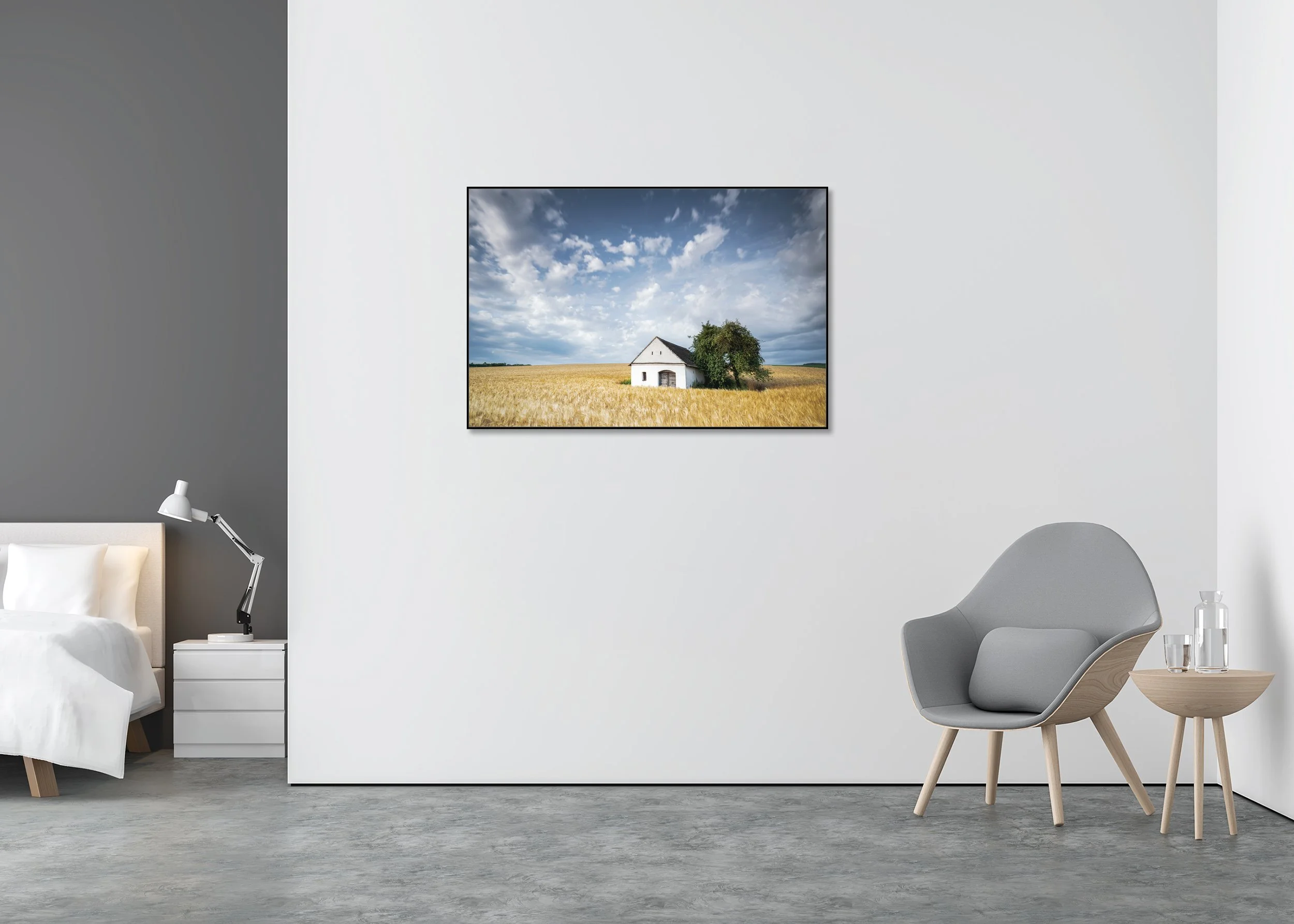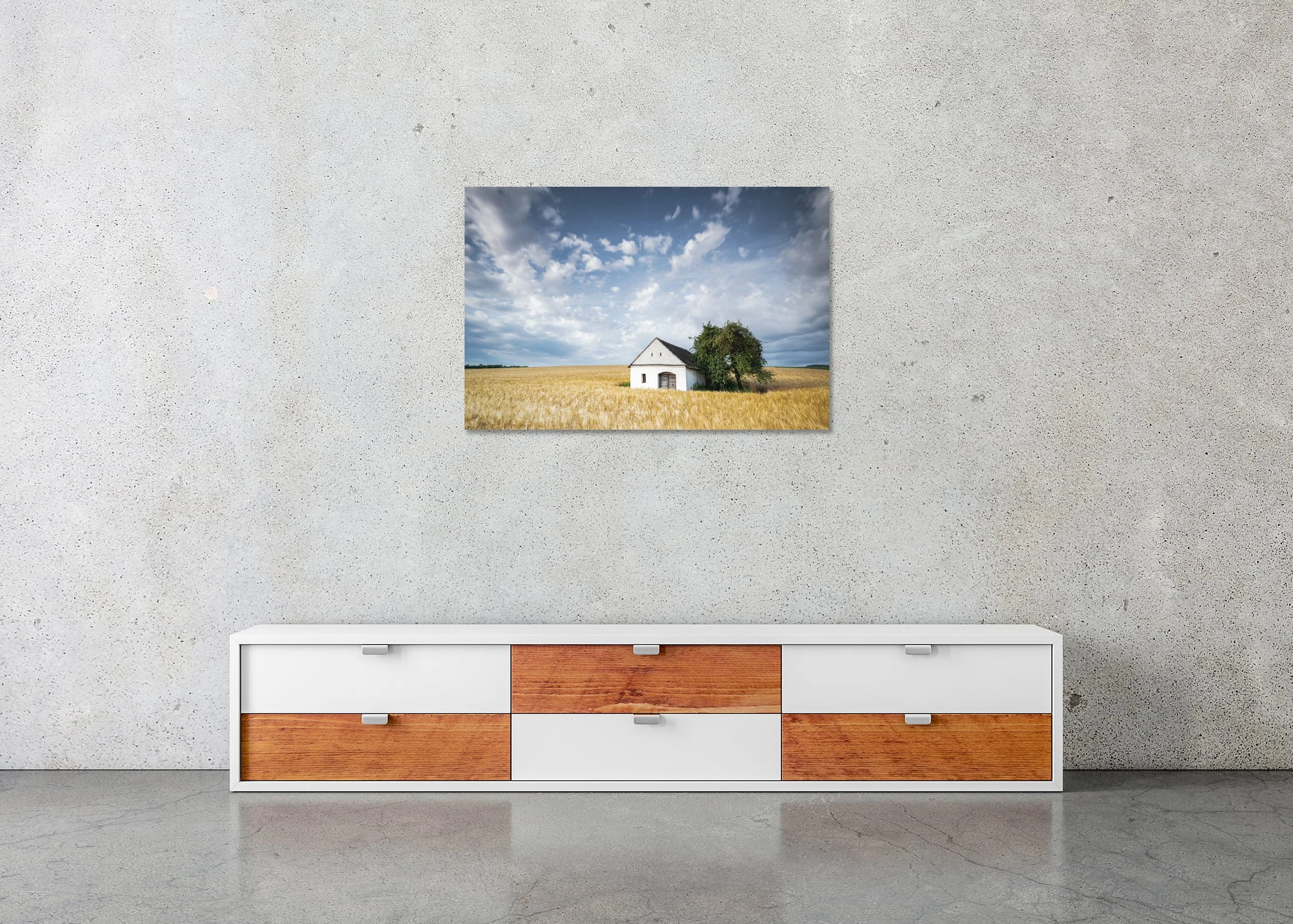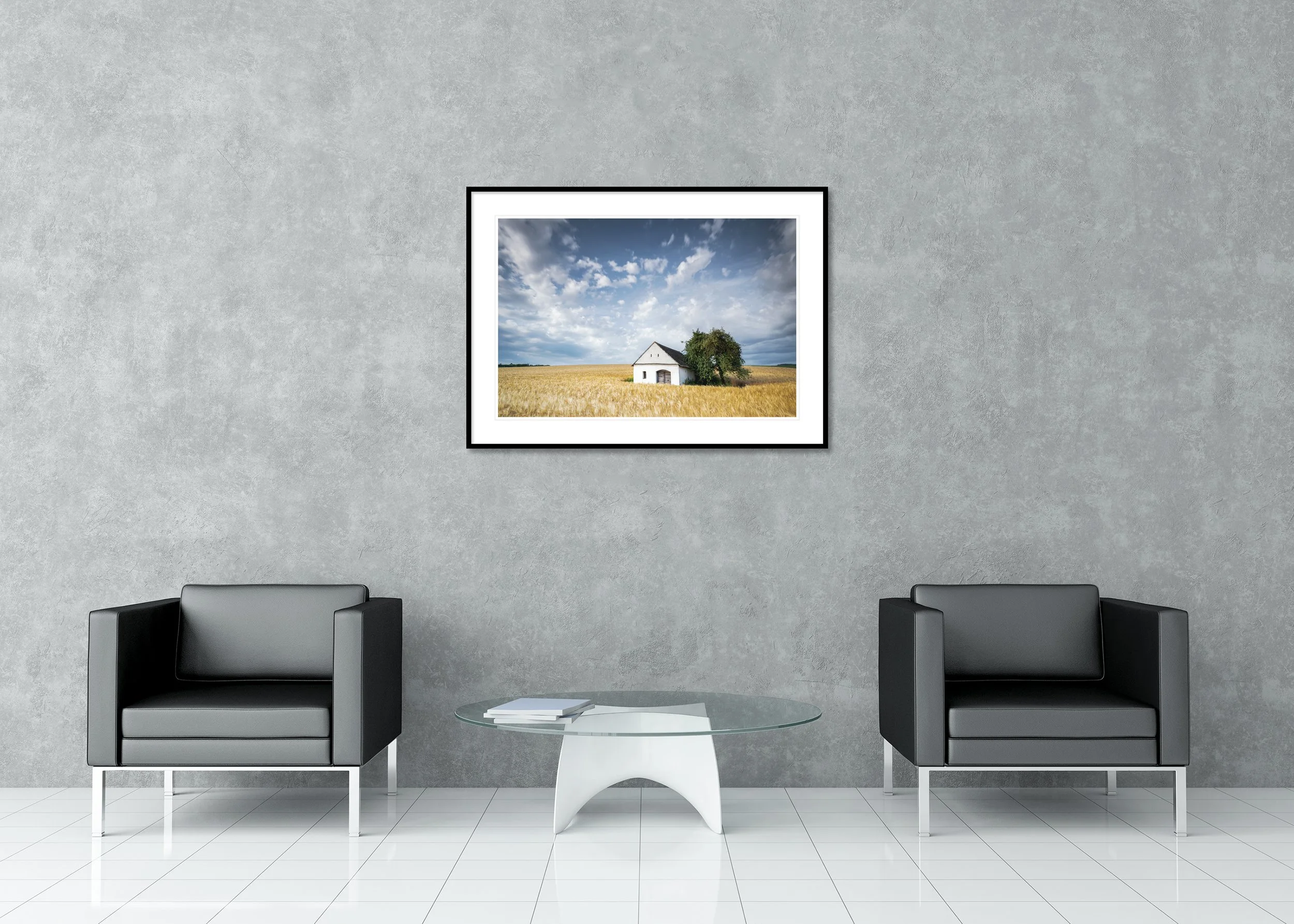 Gerald Berghammer - Color Fine Art Landscape Photography. Small wine press in a golden cornfield, beside a large green tree under a partly cloudy sky.